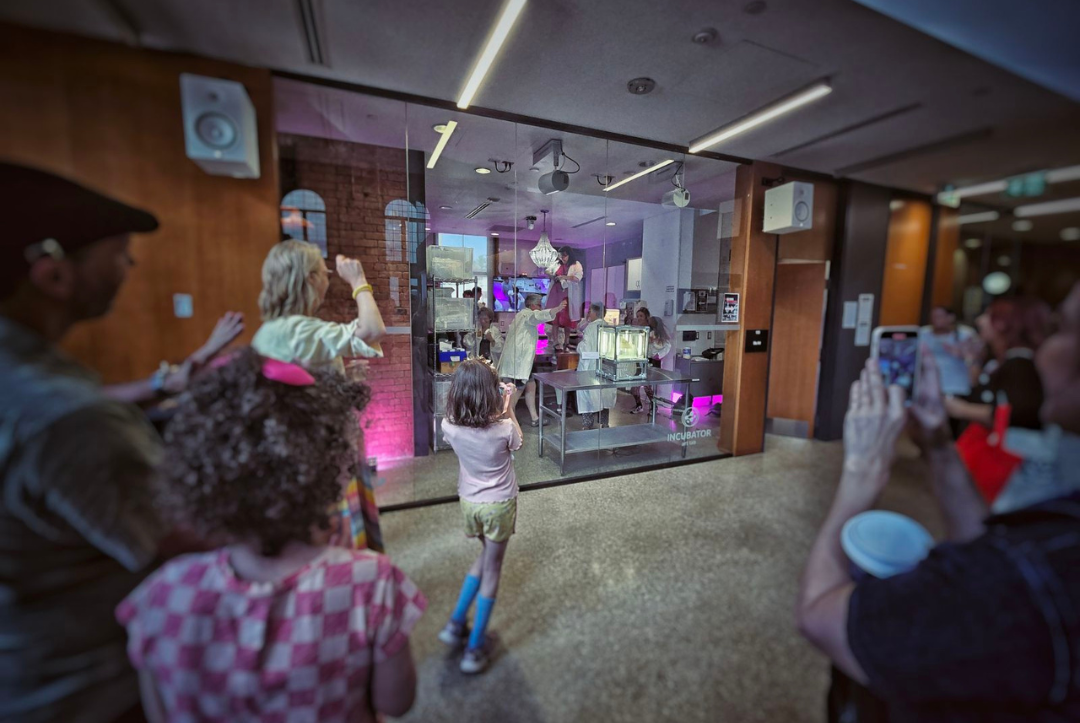 Since 2018, INCUBATOR Art Lab has hosted a range of art installations and performances that highlight the lab as a space where art and science converge. Feasting the Lab (2018) transformed the new facility into an art/science cabaret for over 500 guests, staged before the lab’s certification. During the COVID-19 pandemic, Gratitude Offering for the Organisms (2020) was presented virtually at MIT Media Lab’s global Community BioSummit 4.0, offering a poetic reflection on care across species in the lab. Most recently, during FEMeeting Windsor 2024 and the opening of the exhibition Elegy for a Cell, the lab featured a surprise flash mob further positioning the lab as a stage for experimental performance and collective gathering. These events demonstrate how the lab has served as a platform for performances that blend bioart, scientific discourse, and community engagement.